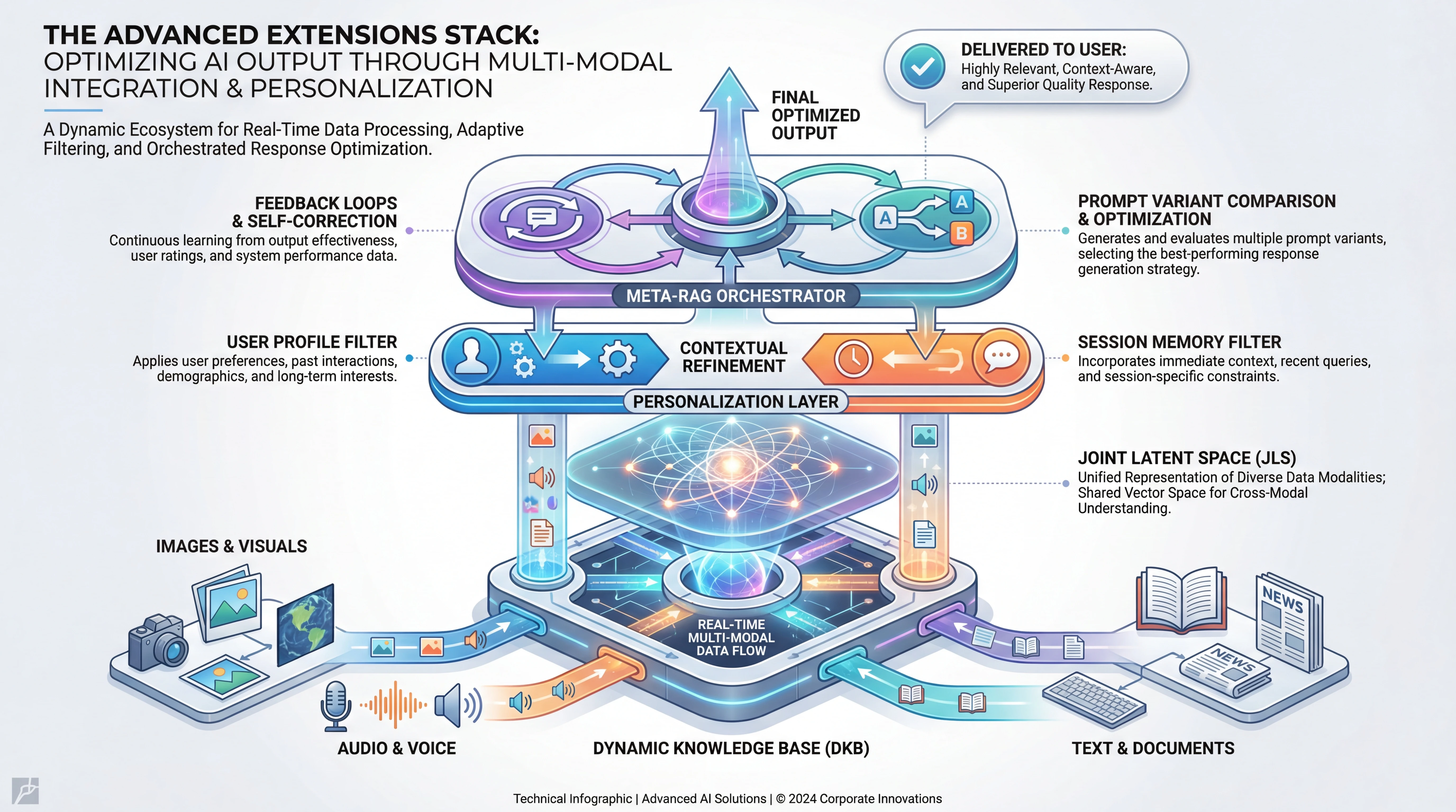 Advanced Extensions represent the evolution of Retrieval-Augmented Generation (RAG) from static, text-centric pipelines into autonomous, multi-dimensional knowledge engines. This architectural shift is defined by four convergent pillars: Multi-Modal RAG, which aligns text, image, and audio into Joint Latent Spaces; Dynamic Knowledge Bases (DKB), which eliminate the "temporal gap" through real-time Change Data Capture (CDC); Personalization, which transforms generic retrieval into user-centric "digital twins"; and Meta-RAG, an orchestration layer that uses A (Comparing prompt variants) to self-optimize the entire system. Together, these extensions bridge the semantic and modality gaps, enabling enterprise AI to reason across heterogeneous data with sub-second freshness and hyper-relevant context.