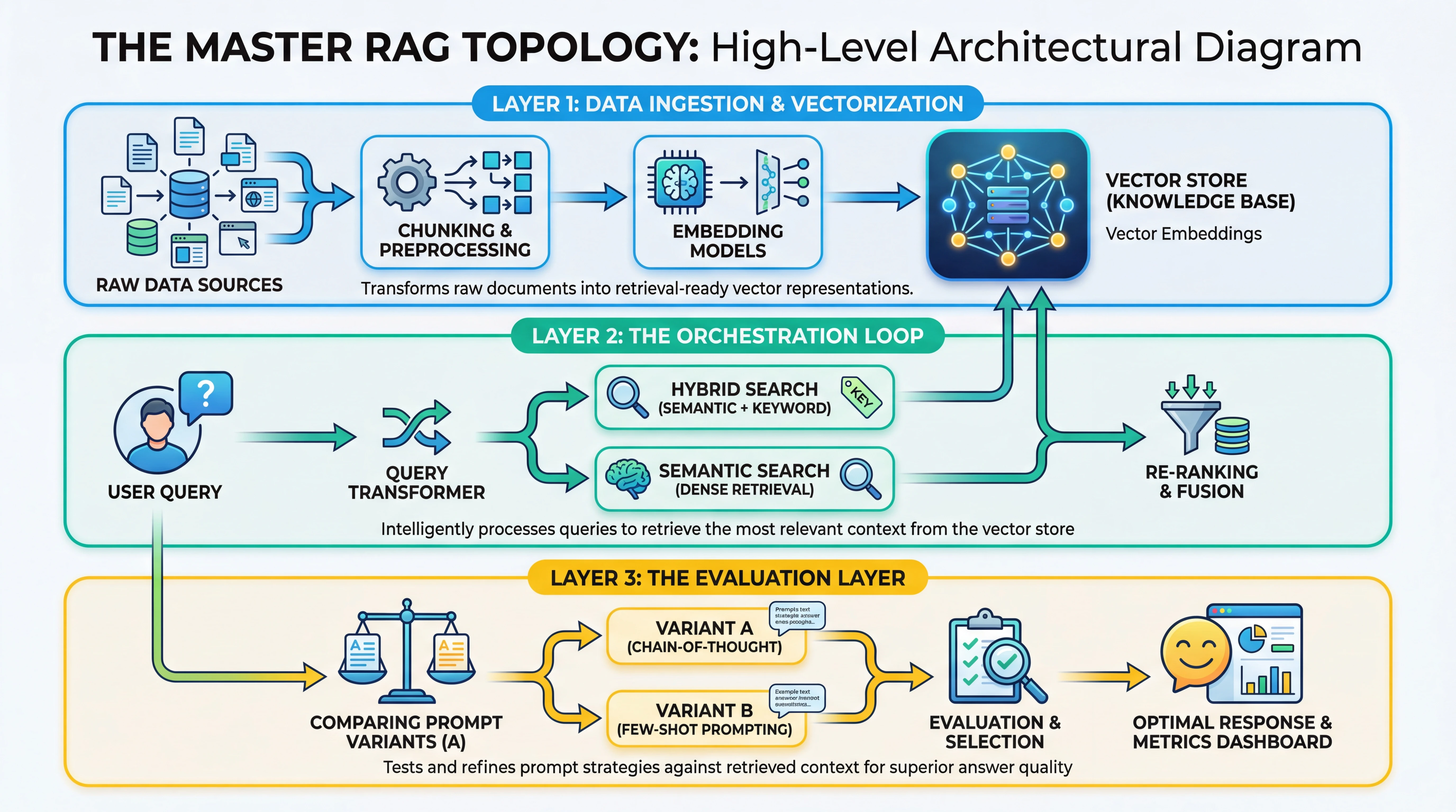 Infographic Description: A high-level architectural diagram showing three distinct layers. Layer 1 (Data Ingestion) shows raw data flowing through chunking and embedding nodes into a Vector Store. Layer 2 (The Orchestration Loop) shows a user query entering a "Query Transformer" node, which branches into multiple retrieval paths. Layer 3 (The Evaluation Layer) shows the "Comparing prompt variants" (A) node, where different prompt strategies are tested against the retrieved context before the final generation node.